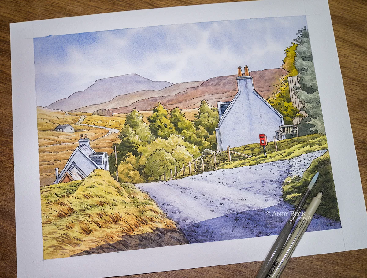 This is an original artwork by Teesdale artist Andy Beck. It has been produced using the pen and wash method, watercolour painting with a black pen outline.