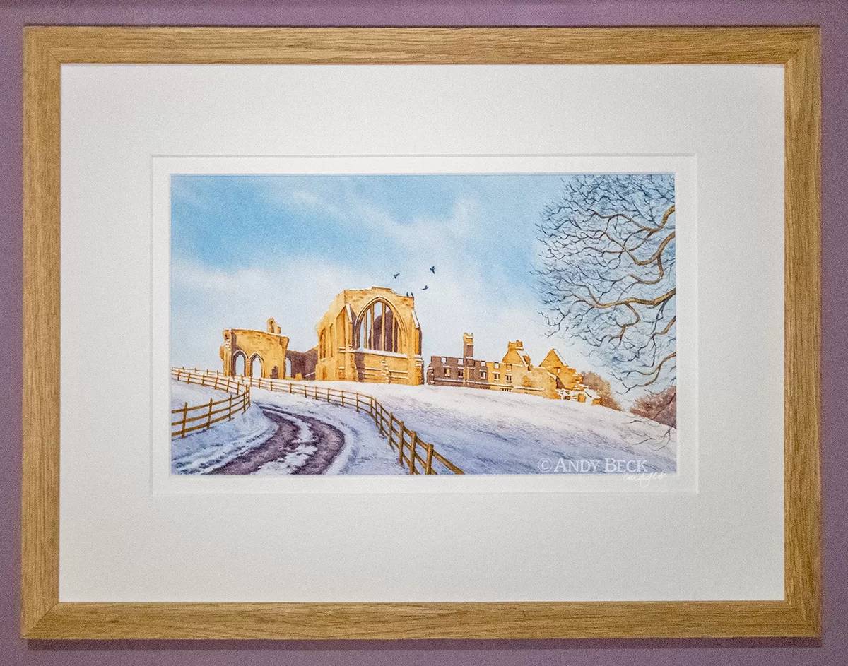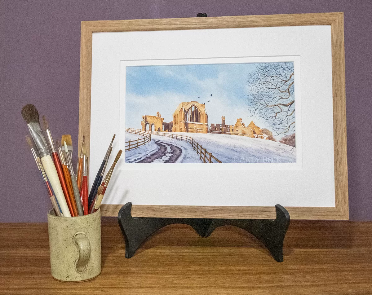 There are two options to purchase this Winter Sunshine at Egglestone Abbey watercolour painting. Either just with a mount (double mounted in off white, 310mm x 410mm overall ) or fully framed. A solid oak wood frame (310mm x 410mm glass size) with a conservation quality double soft white mount and glazed with float glass. The system for hanging is in place on the rear of the frame.