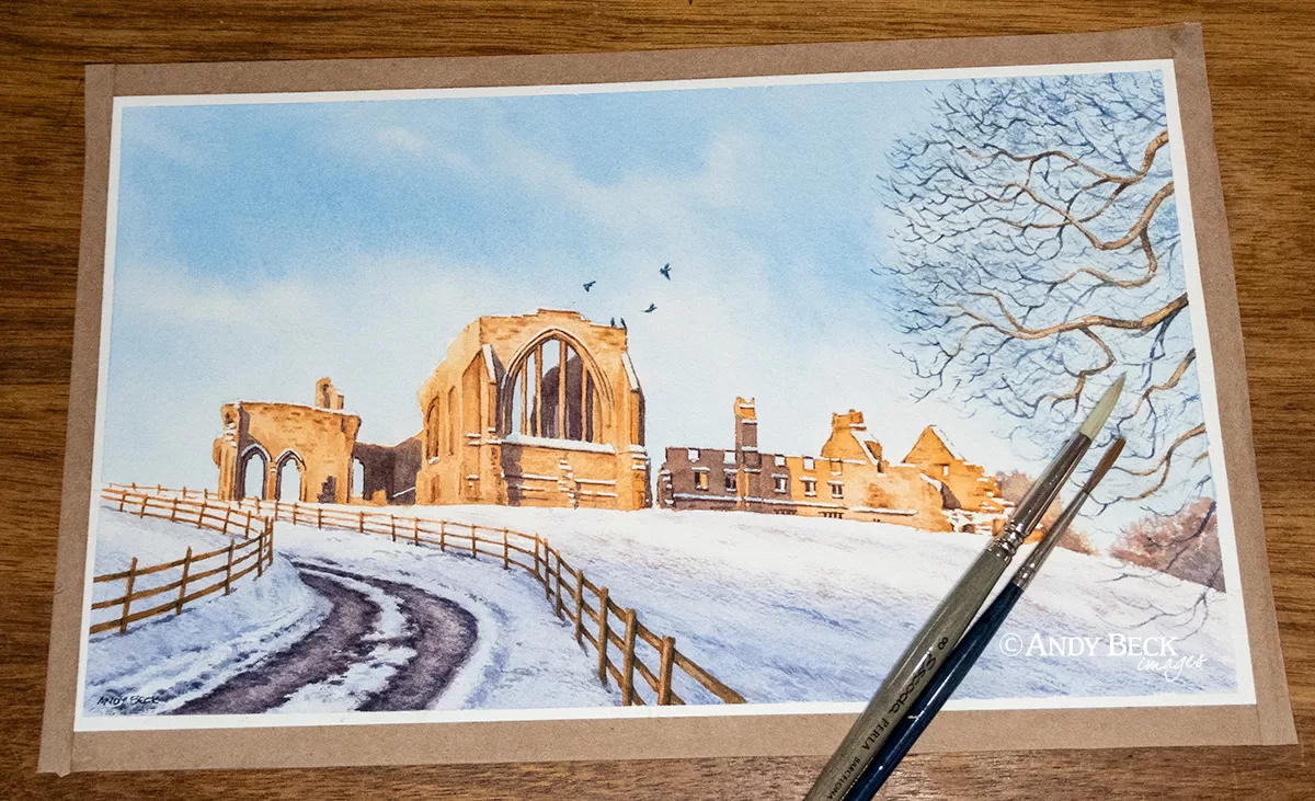 “Egglestone Abbey near Barnard Castle is one of my favourite locations in the dale. Visiting there in winter as the early sun makes the honey coloured stone of the ruins almost glow was a subject that I was keen to paint for some time. This is the result. A group of jackdaws just adds to the scene.”